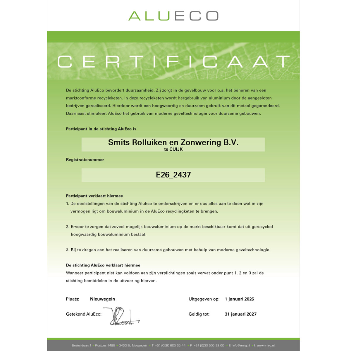 Daarnaast zijn we participant van de stichting AluEco. AluEco bevordert duurzaamheid en helpt een recycleketen voor (bouw)aluminium te organiseren. Als participant committeren we ons om aluminium na de levensduur van een gebouw terug te brengen in die keten, zodat het kan worden hergebruikt in nieuwe bouwproducten.